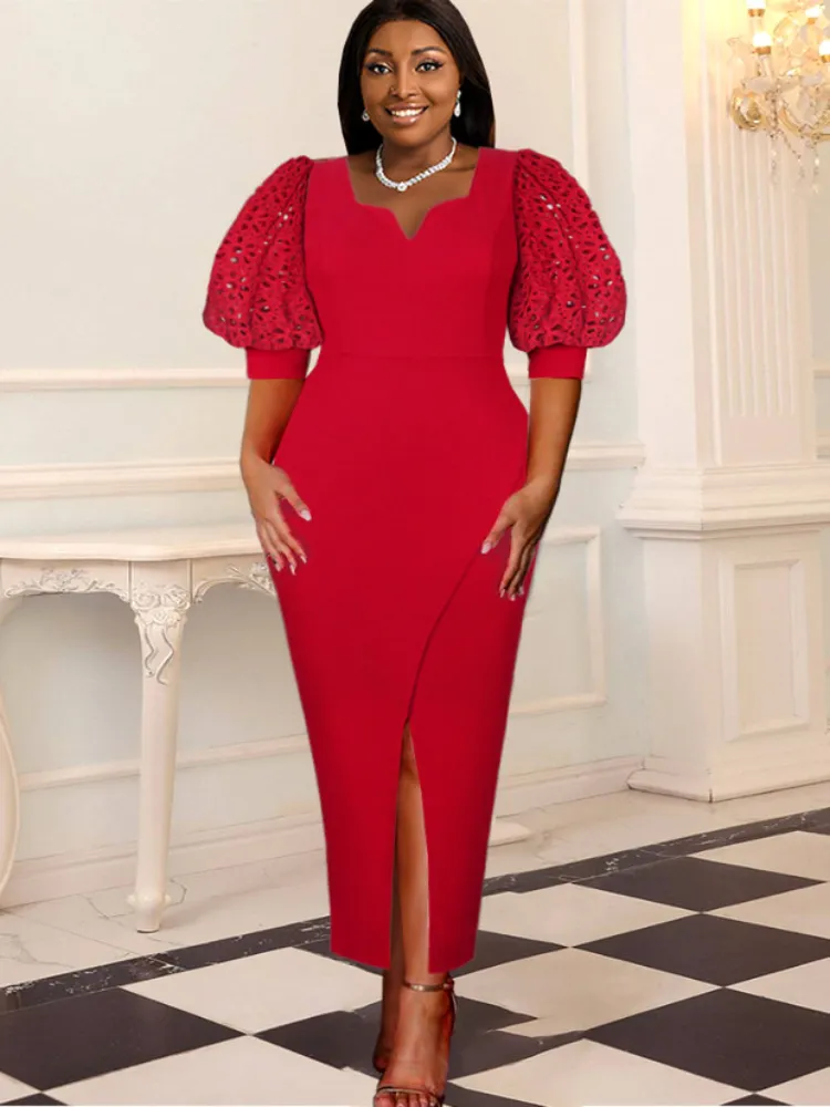 Aomei Hollow Out Short Lantern Sleeve Red Long Prom Dresses Sexy Bodycon Slit Evening Cocktail Birthday Wedding Party Gowns 2023