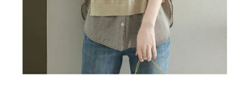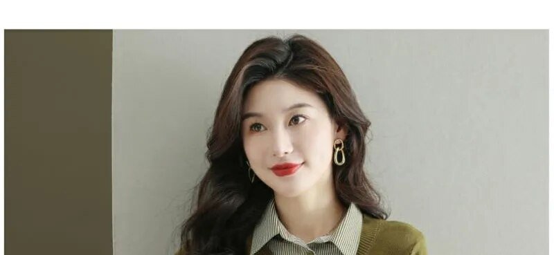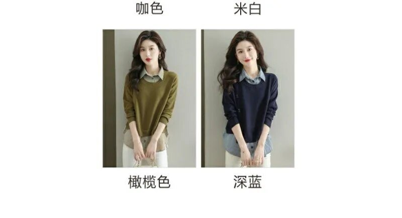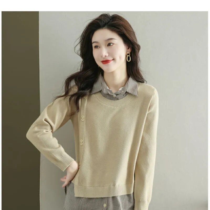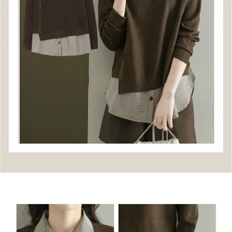 Autumn Winter Fashion Fake Two Pieces Knitted Tops Women’s Clothing Casual Commute Striped Spliced Polo-Neck Sweaters for Female