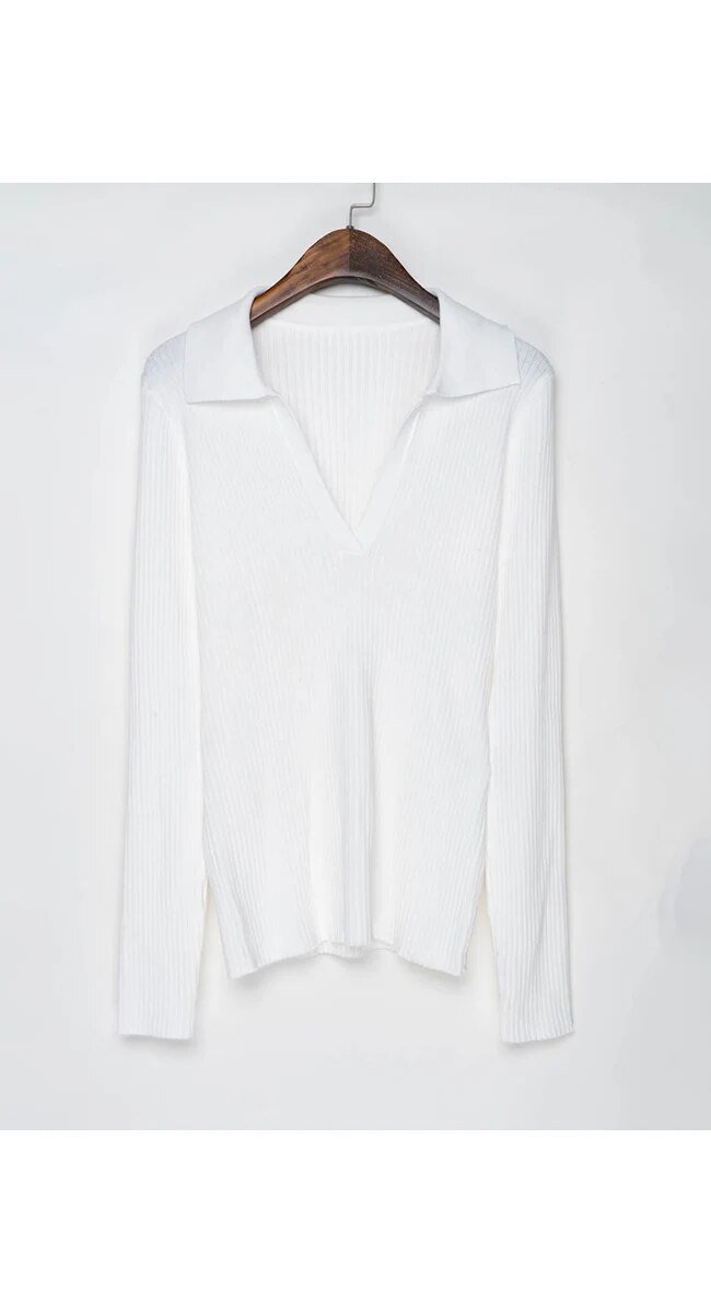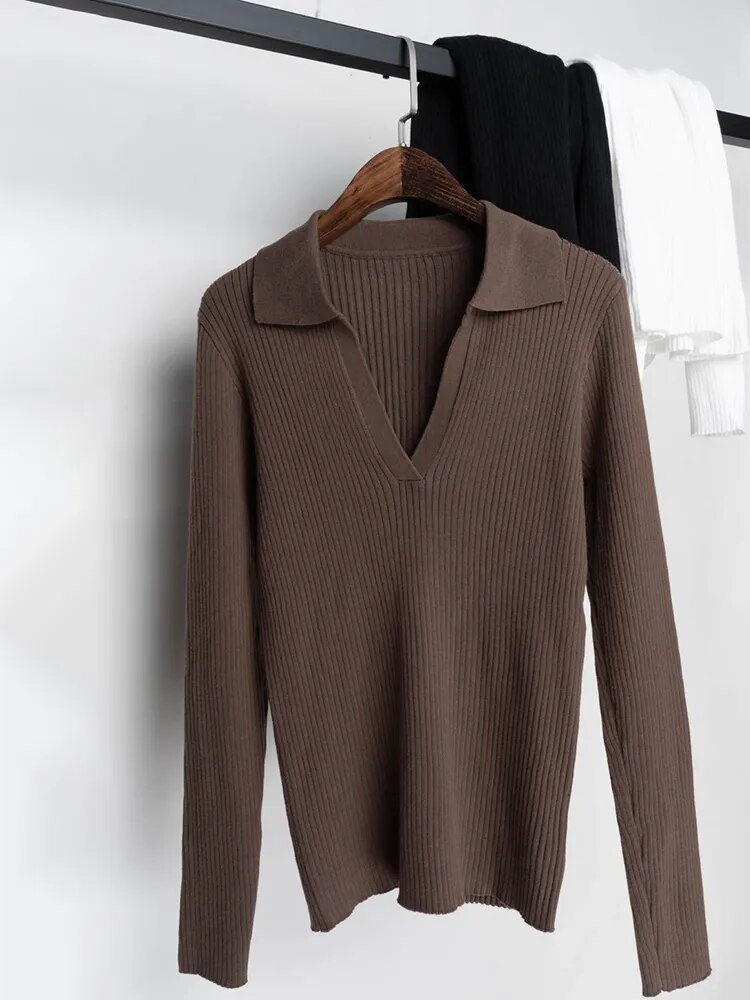 Cotton Knit Polo Sweater Women Long Sleeve V Neck Ribbed Top With Collar
