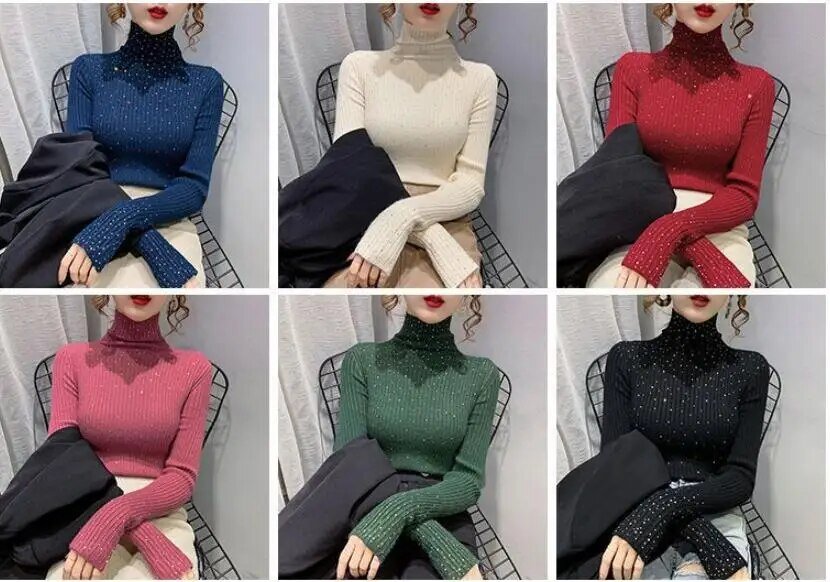 Fashion Women Sweaters 2023 Autumn/Winter Turtleneck Diamond Kintwear Slim Long Sleeve Top Elegant Thick Pullover Female Sweater