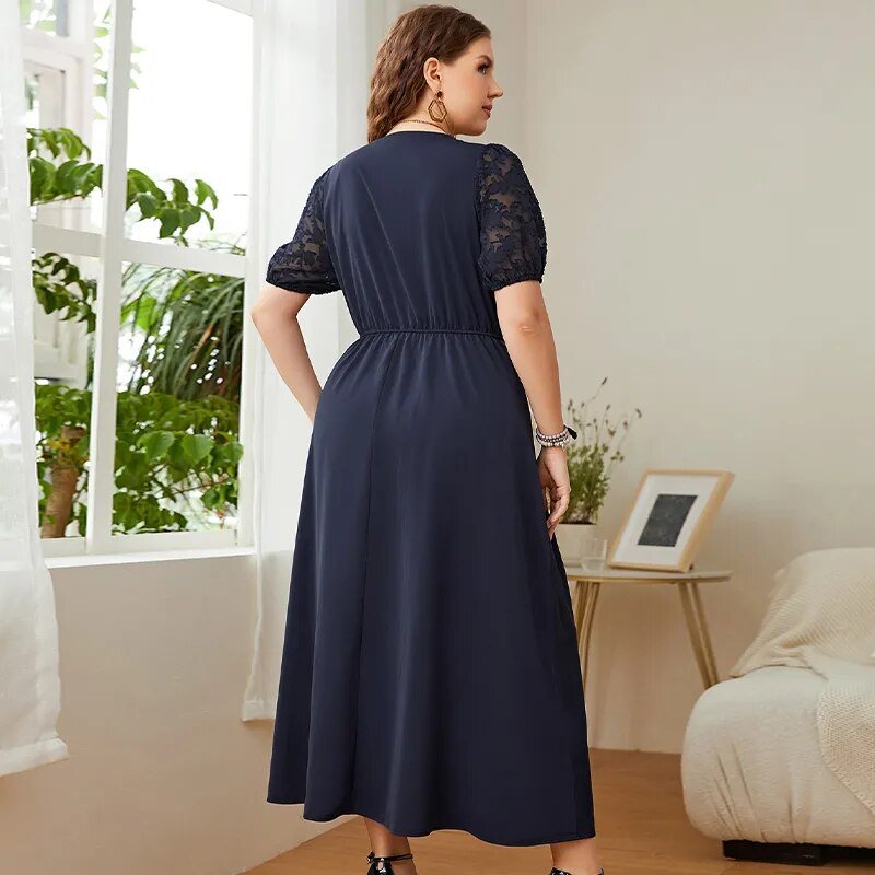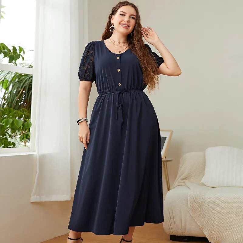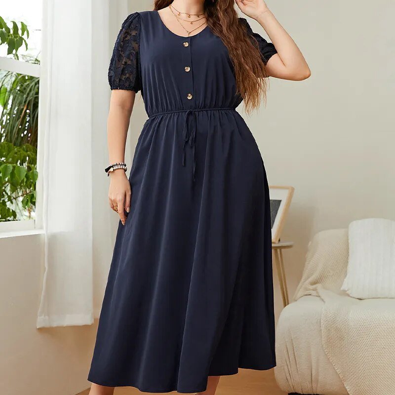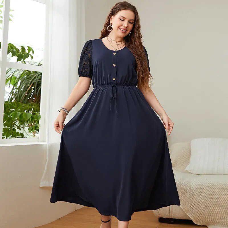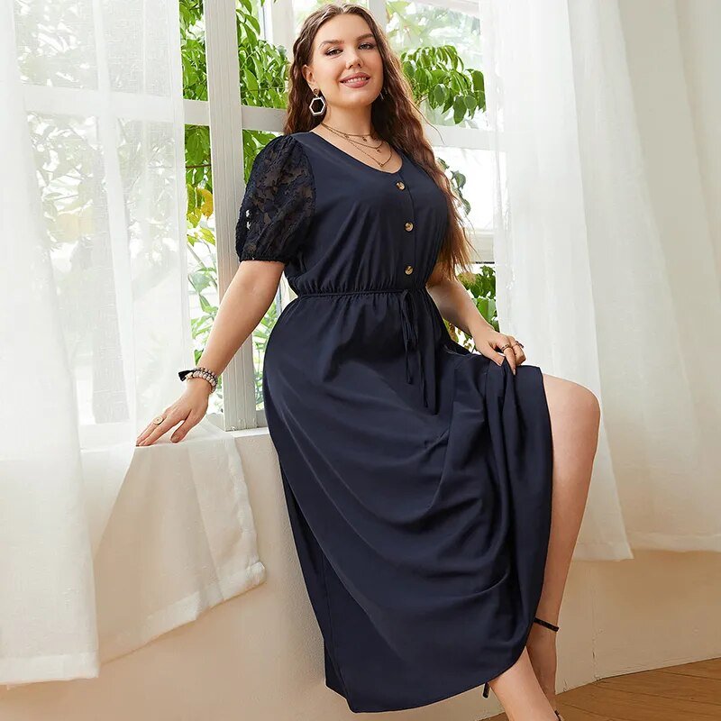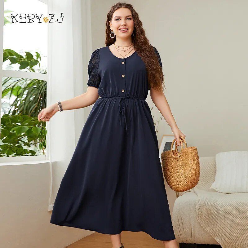 KEBY ZJ Plus Size Solid Button Front Lace Puff Sleeve Dress Women Elegant Knot High Waist A-line Casual Summer Long Dresses 2022