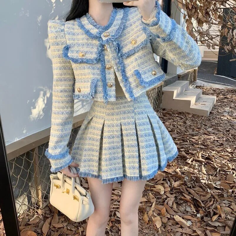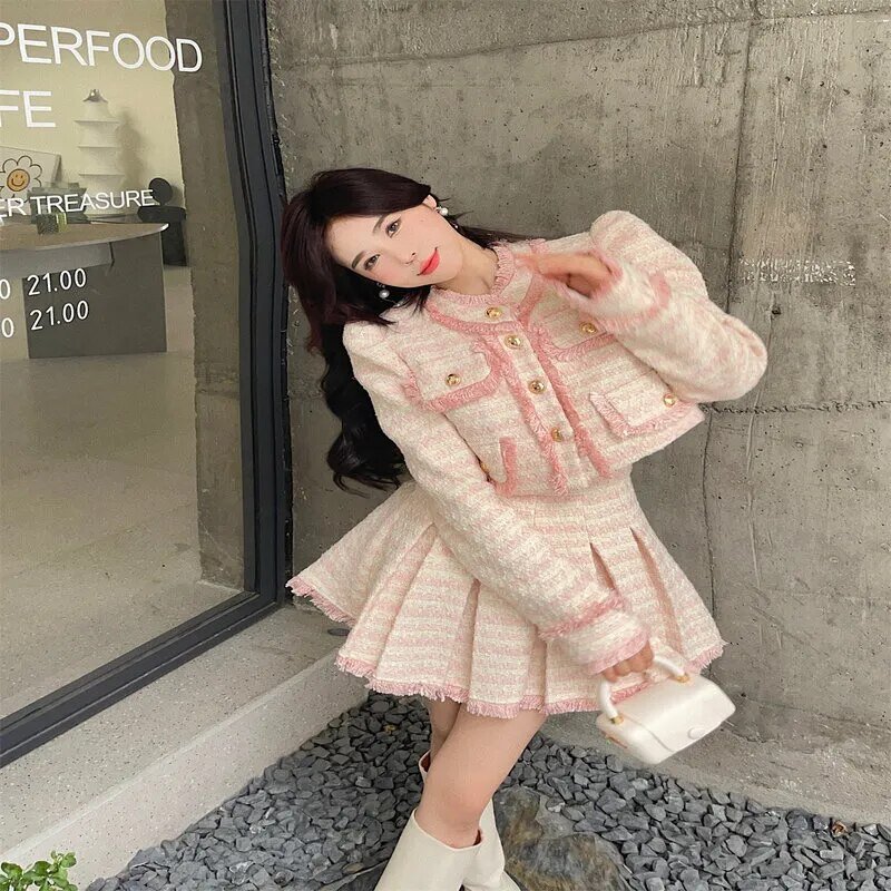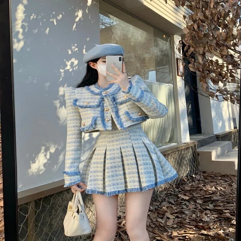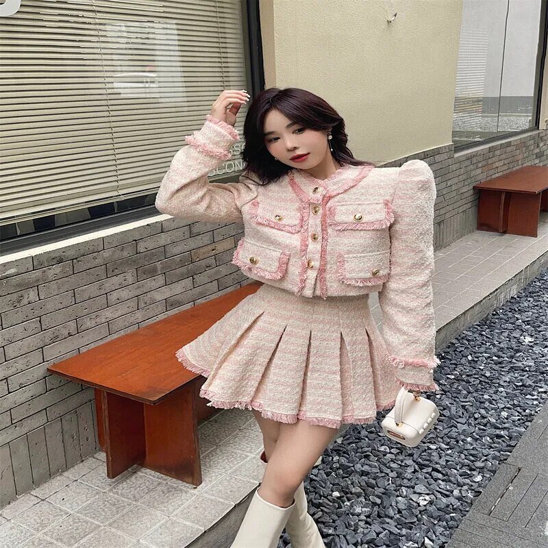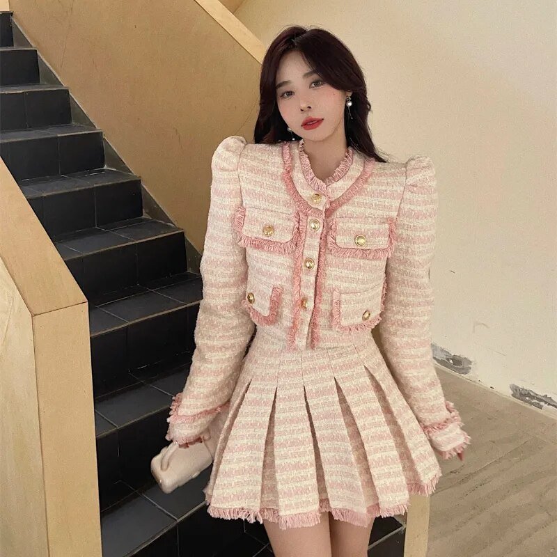 Korean Small Fragrance Two Piece Set Women Short Single Breasted O Neck Puff Sleeve Jacket + High Waist Pleated Skirt Sweet Set