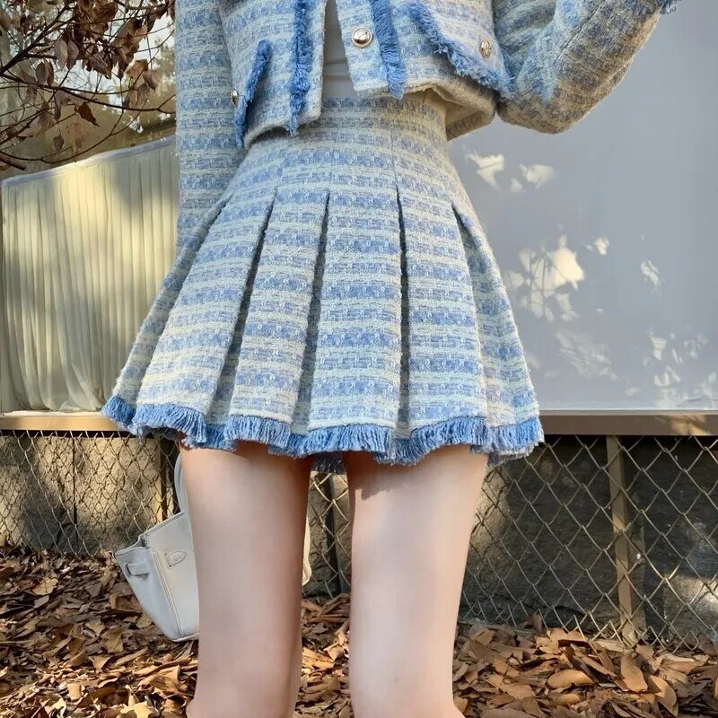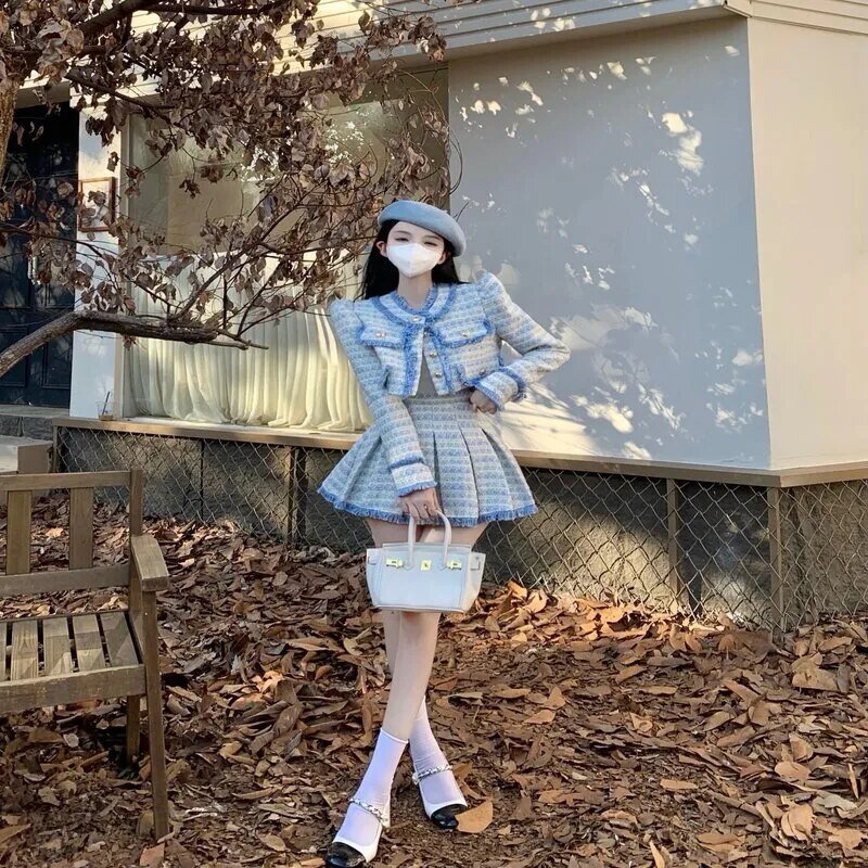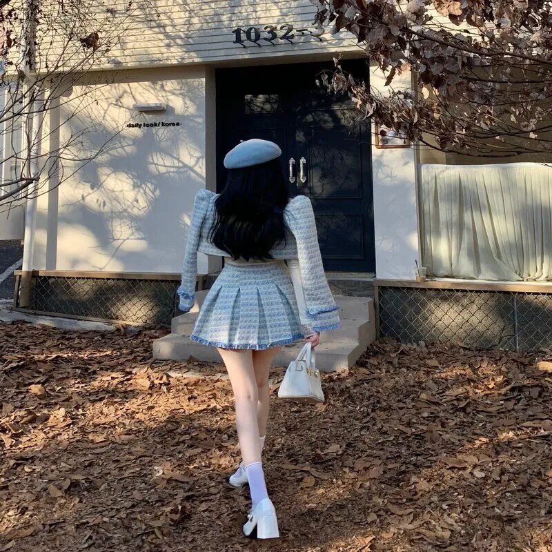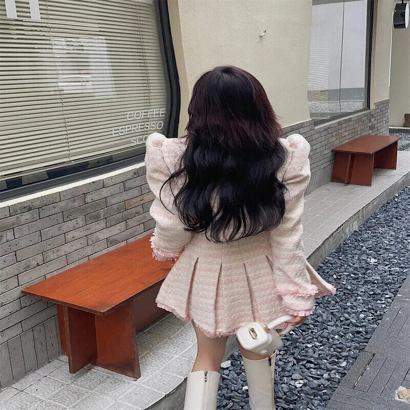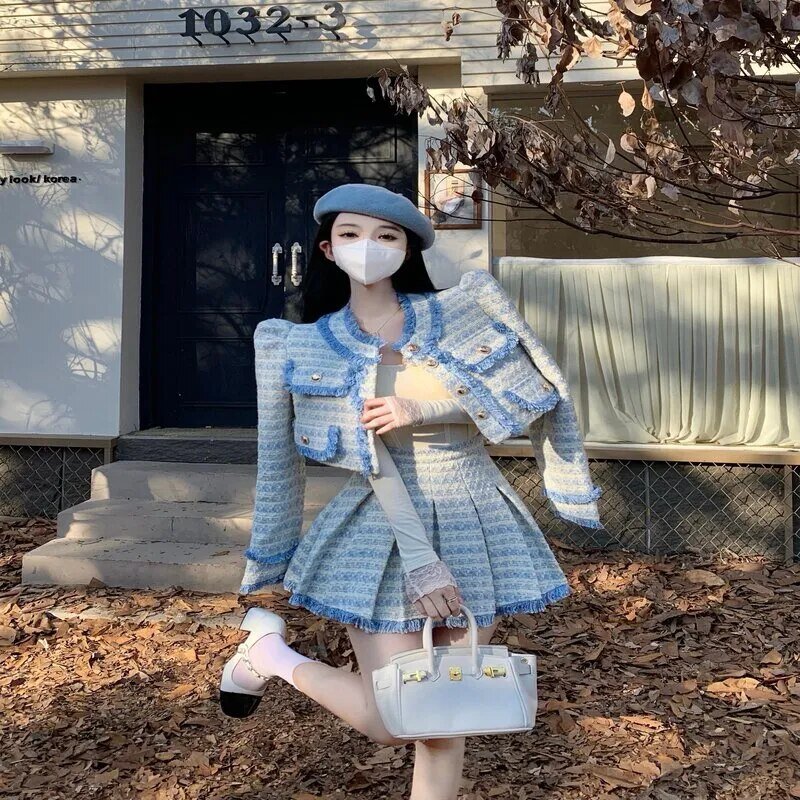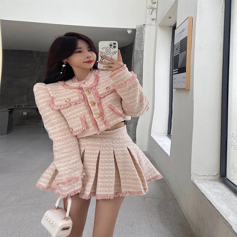 Korean Small Fragrance Two Piece Set Women Short Single Breasted O Neck Puff Sleeve Jacket + High Waist Pleated Skirt Sweet Set