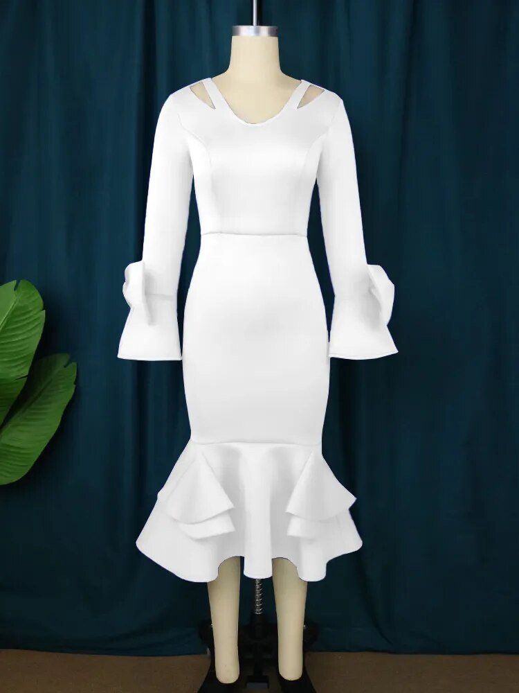 White Bodycon Dresses V Neck Hollow Out Long Sleeve Bowtie Elegant Ladies Wedding Bridesmaid Evening Party Outfits Plus Size 4XL