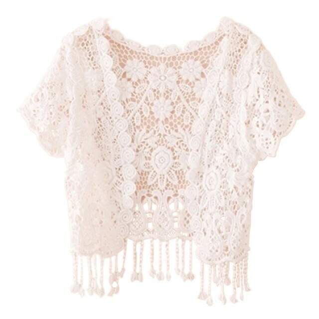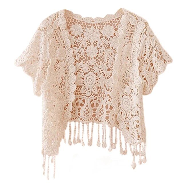Womens Tassels Lace Bolero Shrugs Short Sleeve Crop Top Crochet Floral Open Front Cardigan for Wedding Evening Dresses 101A
