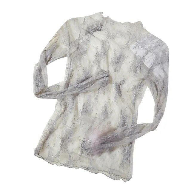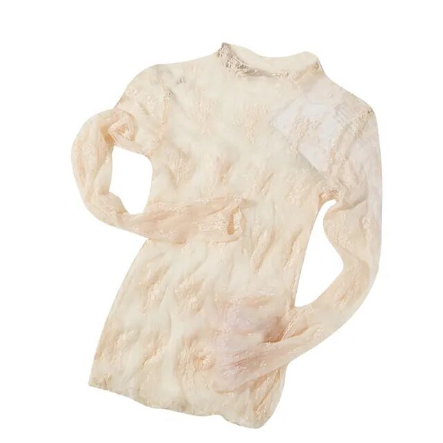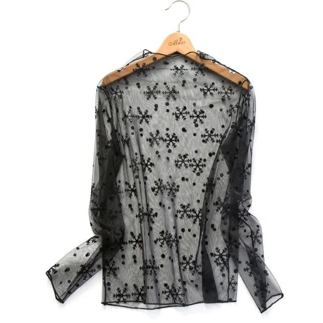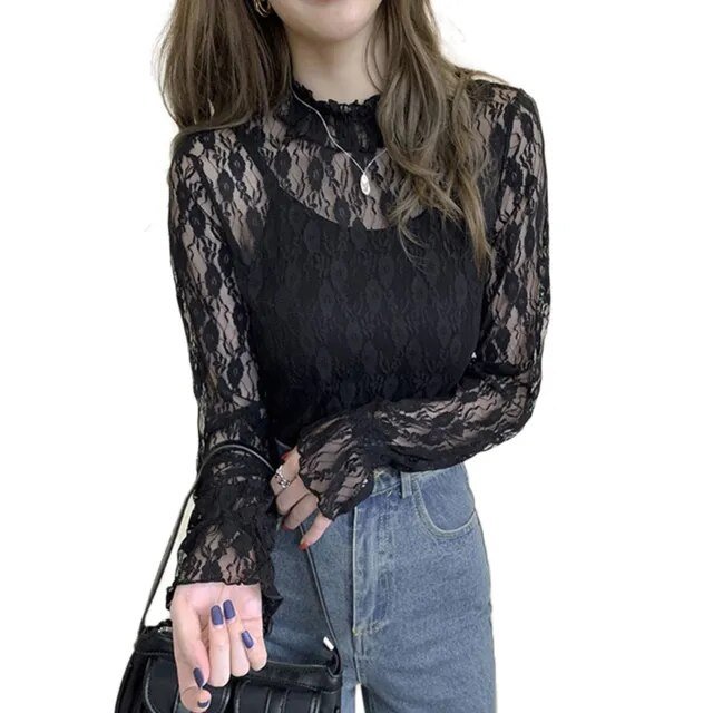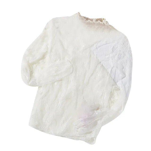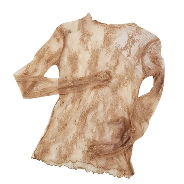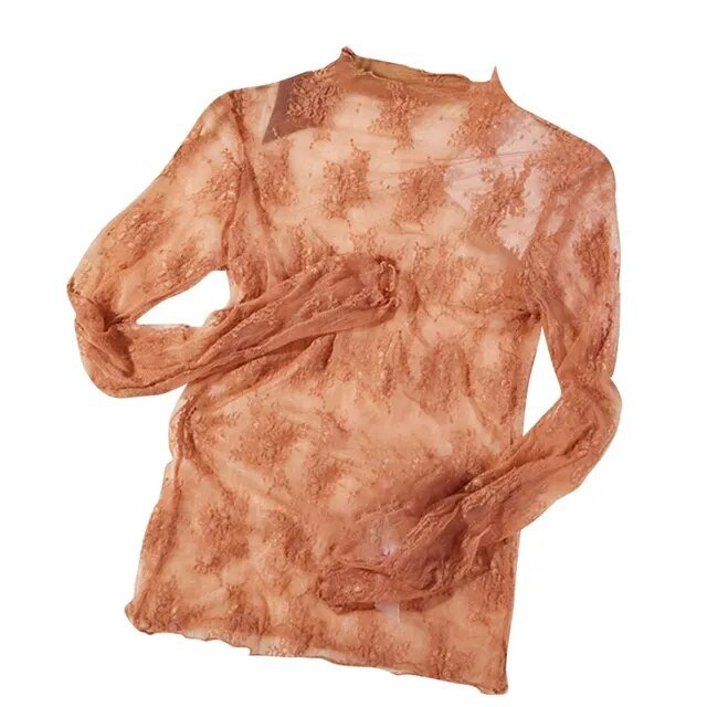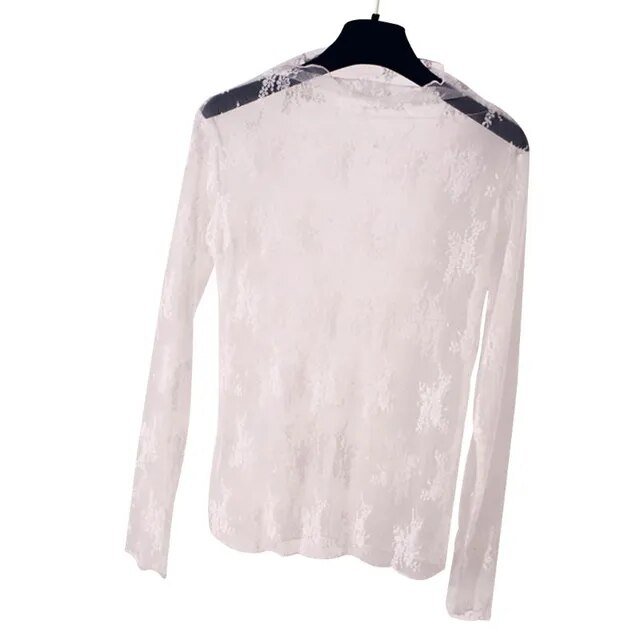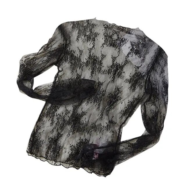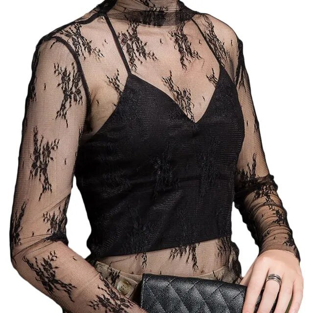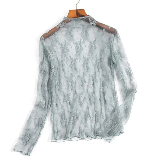 Womens blouses Summer Spring transparent Feminina Mesh Basic Long Sleeve top Mock Neck Solid Color Embroidered Floral Lace