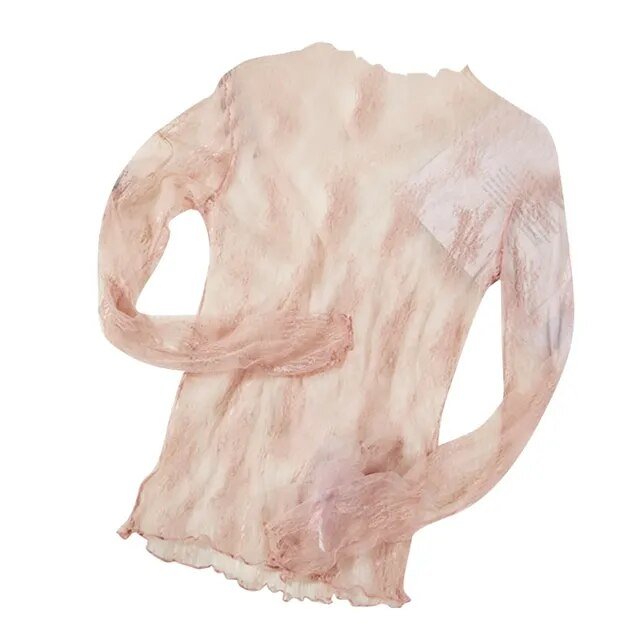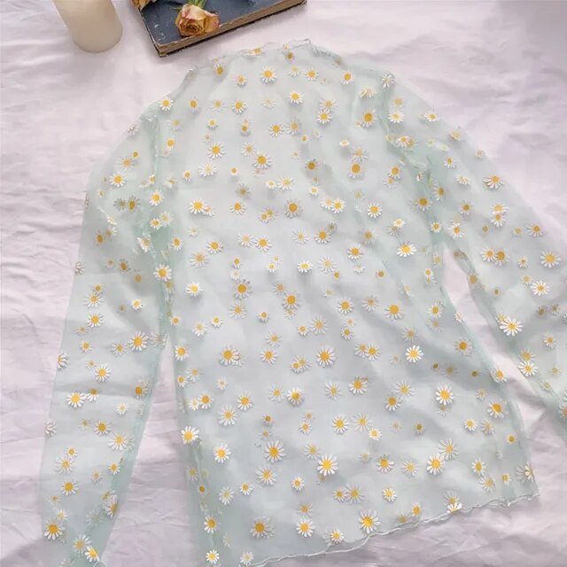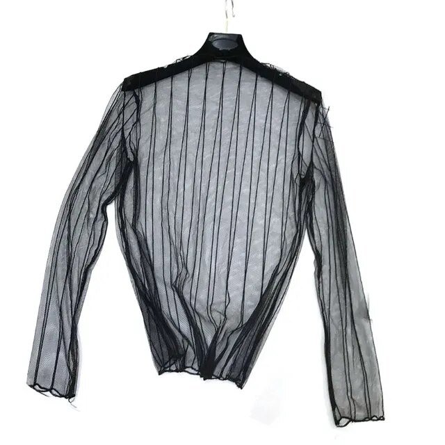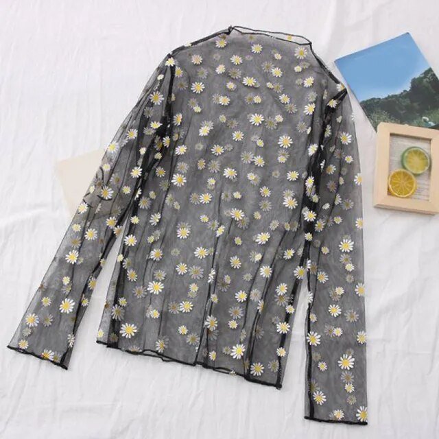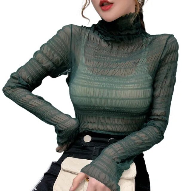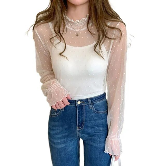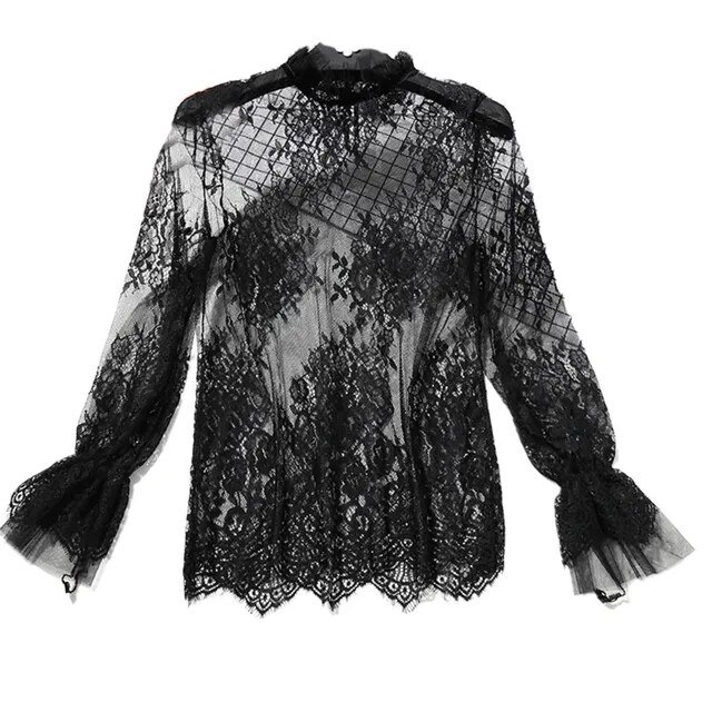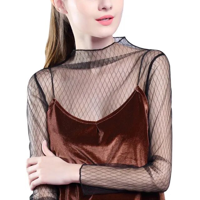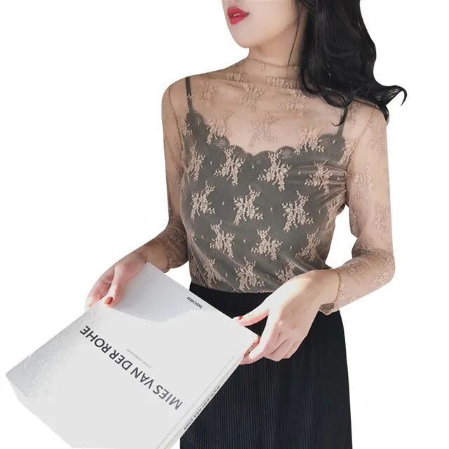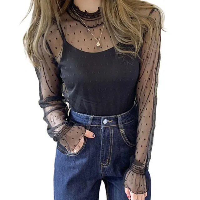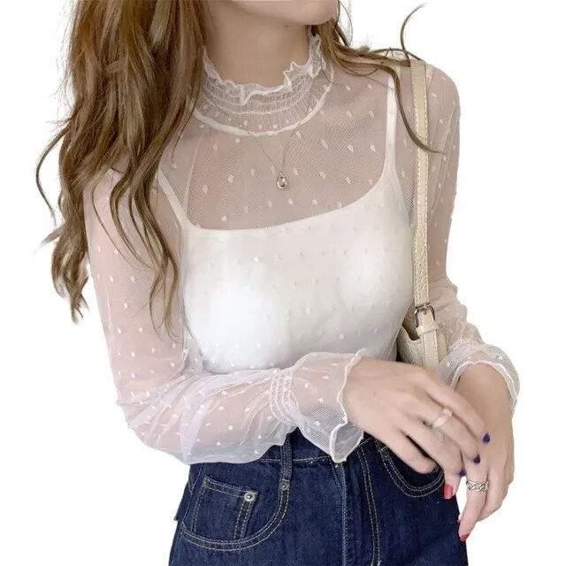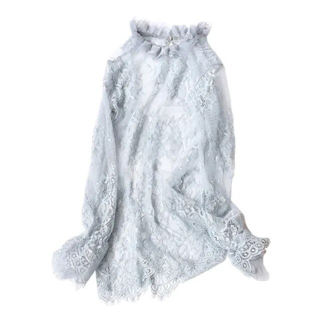 Womens blouses Summer Spring transparent Feminina Mesh Basic Long Sleeve top Mock Neck Solid Color Embroidered Floral Lace