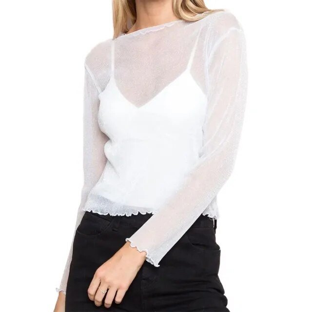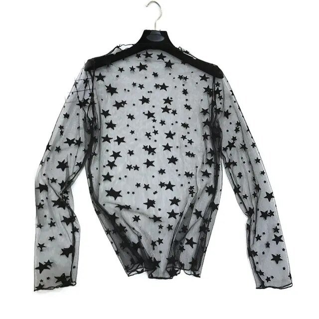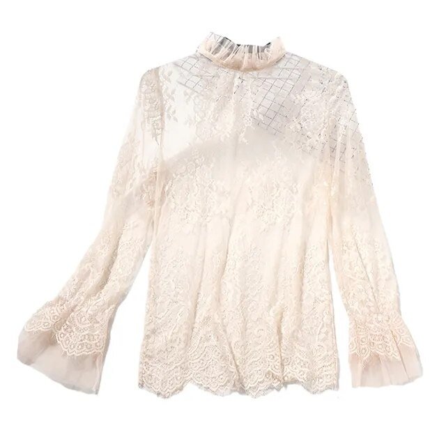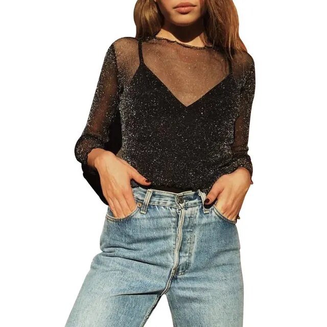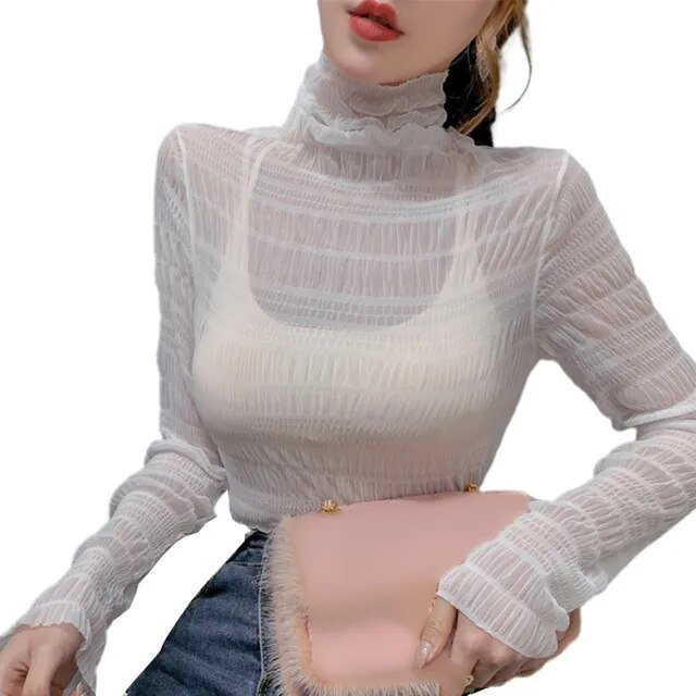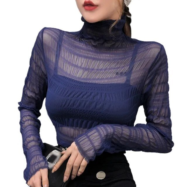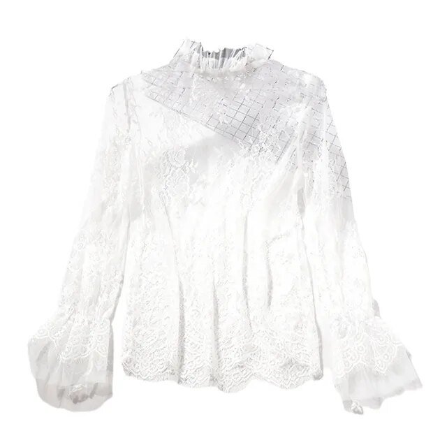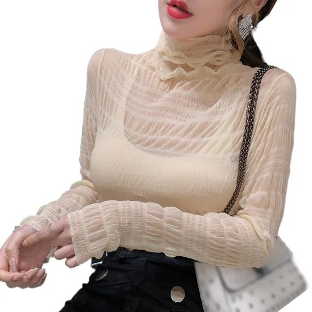Womens transparent blouse top Hollow Out Lace Snowflake Stripes Glitter Pullover Tops Mock Neck Slim Woman bloLong Sleeve Blouse